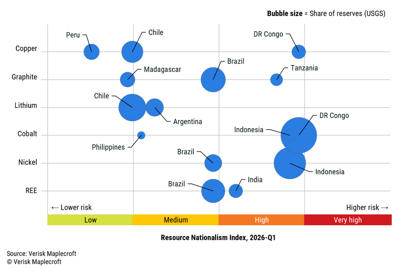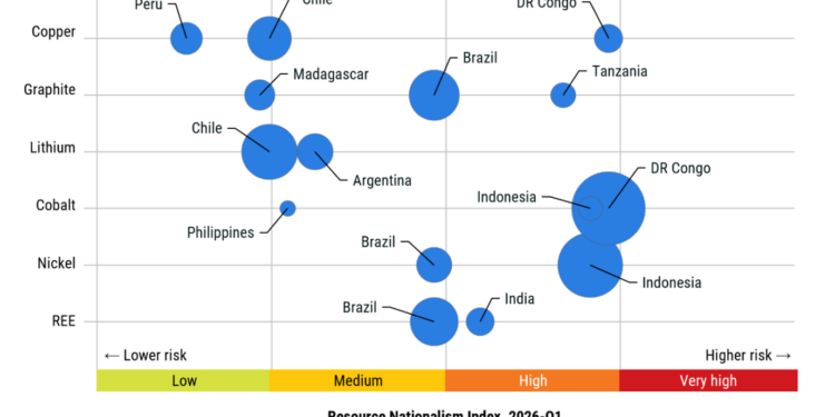 Maplecroft’s methodology centers on its proprietary resource nationalism index, which quantifies the degree of government control over extractive-sector economic activity — encompassing taxation regimes, state ownership mandates, export restrictions, and regulatory unpredictability. The results reveal a stark geographic divide: the DRC, Indonesia, and Tanzania all rank within the global top 20 highest-risk environments for resource nationalism, while Peru, Chile, and Argentina occupy markedly lower positions on the risk spectrum.